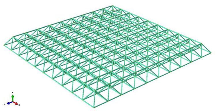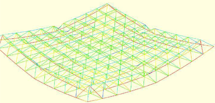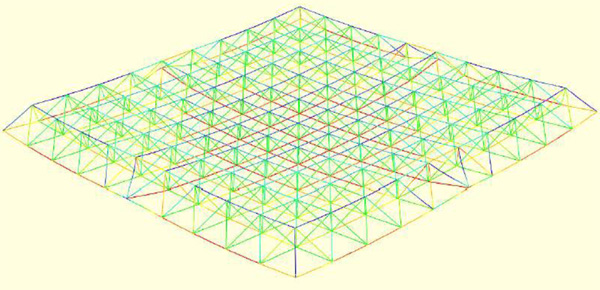 The design of the structure has been done under two different types of loads. The dead load which is equal to 0.5 KN/m2, consists of the load of the covering and the joints. And the snow load which is equal to 2.0 KN/m2. In this model, the dead loads and the snow load have been exerted on the joints of the upper layer as concentrated loads, proportionate to the load bearing area of each joint. As an exception, the four diagonal members over the support nodes are considered to be solid bars so that the local collapse of these members and the instability of the entire structure will be prevented.