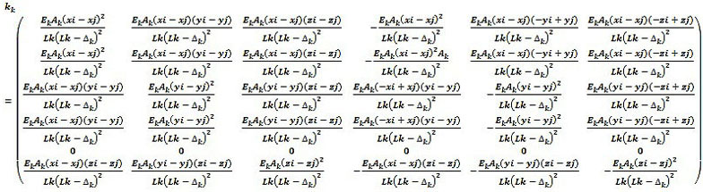 Applying equilibrium equations at each joint, it would get enough equations to solve the unknowns (ui,1, ui,2, uj,1, uj,2, and Nko). Stiffness matrix of a truss element with length imperfection can be defined as follows: Eq. (6).
