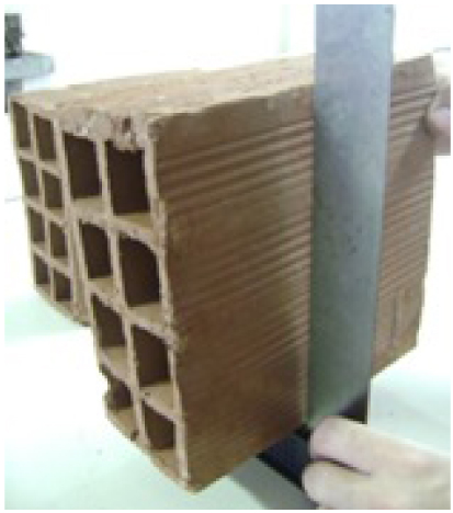 The septa measurements were made in the central region of the clay blocks, using at least four values, searching for the narrowest septa, as shown in Fig. (2a). The flatness of the faces was determined by the arrow formed in the diagonal of one of the facing faces of the block, according to (Fig. 2b).