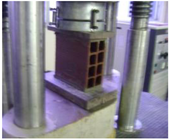 The mechanical characteristics of the ceramic clay brick blocks were evaluated by individual compressive strength. For the accomplishment of this test, a total of 13 specimens were properly prepared. The regularization of the two faces destined to the settlement perpendicular to the block length was done with cement and a maximum thickness of 3 mm in order to uniformize the block surfaces.