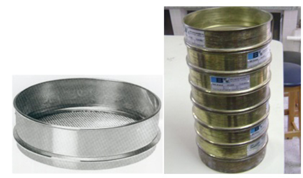 The determination of the granulometric composition aims to classify the aggregate as a function of the size of the grains. The test method is described in NBR NM 248 [14] and to determine if it is necessary to collect two samples of the aggregate to be analysed which must then be washed and preheated to a temperature of (105+5)° C. Its classification occurs through a set of sieves with openings standardized by ABNT (Fig. 5). The assembly is organized in a decreasing manner so that the sieves of larger apertures overlap the sieves of smaller apertures; the material is then sieved so that each fraction is retained in the sieves, and then separated and weighed. Fig. (5) illustrates the procedure.