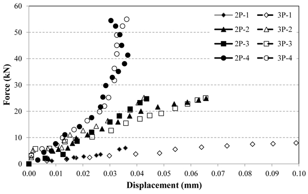 Finally, Fig. (7) shows the mean displacements observed during the application of load in the prisms of two and three blocks, respectively. From the analyses of this figure, it is possible to observe that for the prisms of 2 and 3 blocks, without coating, the hardness was lesser than in the other prisms studied. In general, significant difference behaviour in the prisms with strong and weak mortar, both for prisms with 2 and 3 blocks was not observed. However, the reinforced prisms present higher performance in comparison with the other prisms studied; aspects that suggest the importance of the reinforcement performed.