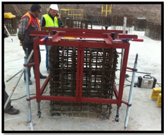 Installation and fixing of bottom dowels: The installation of the isolators starts with the placement of the dowel which is served as a bolt hole to the lower base. The dowels are installed with the help of a steel gage plate cut on CNC benches, taking into account the type of isolator on the project (Fig. 10). Using the red table illustrated in Fig. (11) in coordination with the map technician, the grade and distances are adjusted and the dowels are fixed to the bars by means of the steel gage plate.