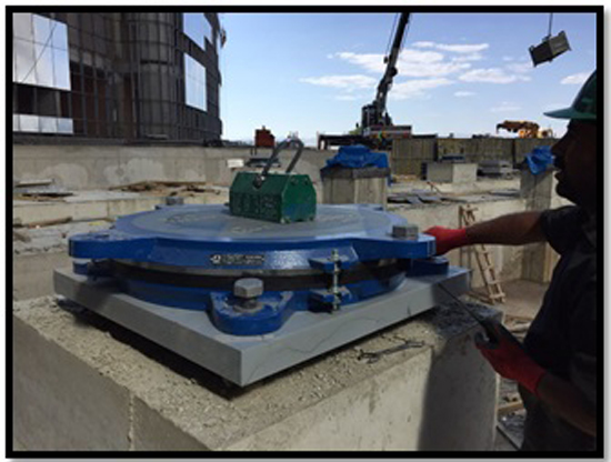 Installation of isolators: After installing the plates, isolators are placed on the plate taking care of the x and y axes. Hydraulic pressurized torque device is set to the torque values taken part for isolators in the project and the bolt tightening operation is performed, and the isolator installation process is completed as in Fig. (16).