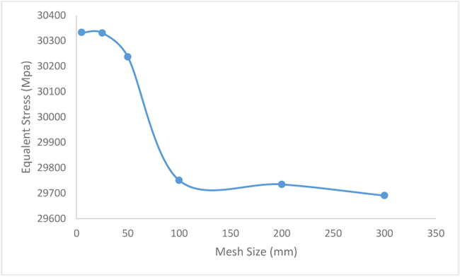 Therefore, tetrahedron meshing with 10-node (every node of this volume has three degrees of freedom) selected for solving FE models. Mesh sizing is important for accurate stress value. For this purpose, selected meshing type, the tetrahedron mesh divides various sizing mesh starting with 300 mm. When the stress and displacement values are stable, this mesh sizing can be applicable for FE analysis. Table 2 and Fig. (5) illustrate that mesh sizing is important to find the exact stress values.