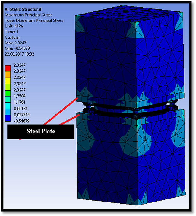 In this study, it is aimed to compare the stress distributions on the isolator by modeling in the ANSYS Workbench v16 program. The load distribution inner part of a column is a very important point for design purposes of seismic isolators. Thus, the symmetrically application of loads not only improves the behavior of the column, but also the behavior of the investigated isolator system. To decide the best application system for the base isolator, this modeling work has been adopted. The first model was simulating the directly connection of the isolator, and the C50 concrete; the second one was simulating the connection of the St355J2, the steel plate, and the isolator. The ANSYS-Workbench [12] is used for predicting compare the stress distributions on the isolator of the numeric models. The concrete and the steel are modeled as solid elements. One of the most important steps in finite-element (FE) analysis is the creation of mesh structure. The sweep, automatically generated, tetrahedrons and hex-dominant are meshing method in ANSYS-Workbench program. The sweep method cannot be used in plate or concrete connection models. The non-sweepable bodies force the sweep method controlling. The automatically generated, tetrahedrons and hex-dominant method meshing compare their created nodes and elements for the same sizing. Thus, as a result of research for CLI model is used to mesh with these generation types from the guidance of some given literature [2, 5] and elsewhere. The mesh size is taken as 50 mm for each method. It is observed from the Table 1 that, automatically generated tetrahedrons and hex-dominant meshing methods give different values for nodes and elements.
