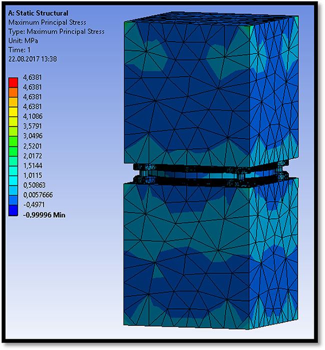 Furthermore, Fig. (5) shows the maximum stress values of the models, and 5, 25 and 50 mm mesh sizing are similar. The variation of the stress values is becoming very rough, and as seen from the Fig. (5) , the curve is becoming asymptotic for less than five mm mesh size. Because of the memory allocation and computer analysis time problems, the mesh size is decided as 50 mm for FE analysis. Fig. (6) shows that, the model is simulated by using the nonlinear finite-element method (FEM), and the results are presented by taking a section of the foundation under the isolator and the underlying reinforced concrete. In the Sap2000 program, 30 kN axial pressure load, which is the critical column load, was analyzed through the column.