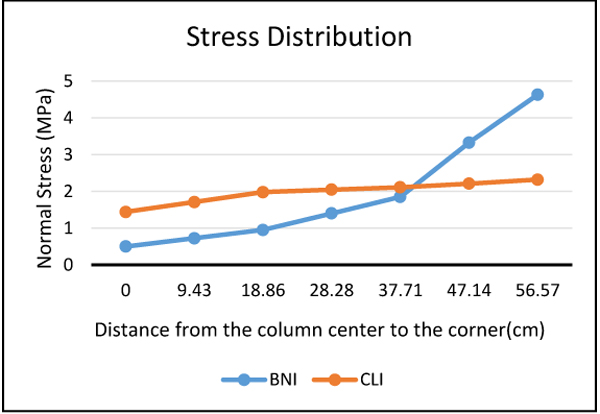 Fig. (7) shows the maximum normal stress curves obtained from the results of the FE analyze of the isolator model using steel plates and the isolator model directly placed on the concrete Fig. (8) and Table 3 shows the minimum and maximum normal and shear stresses. Fig. (9) shows a stress distribution curve that summarizes the purpose of the study. In this curve, the center of the column with dimensions of 80 x 80 cm is considered as the center “0” point and the distance to the column corner is divided into 6 equal distances (6 x 9.43 cm = 56.57 cm) stresses were measured. In this curve, it is seen that tension is uniformly distributed between the column center and the column corner for the CLI, while tension increases from the center to the corner for the BNI. As can be seen in the curves and figures, using steel plates on the upper and lower sides of the isolators ensures that the stresses on the isolator are reduced and the upper base transfers the building's load more uniformly. In other words, steel plates which facilitate the manufacturing process will be able to transfer the appropriate load in terms of insulators if the application is done correctly.
