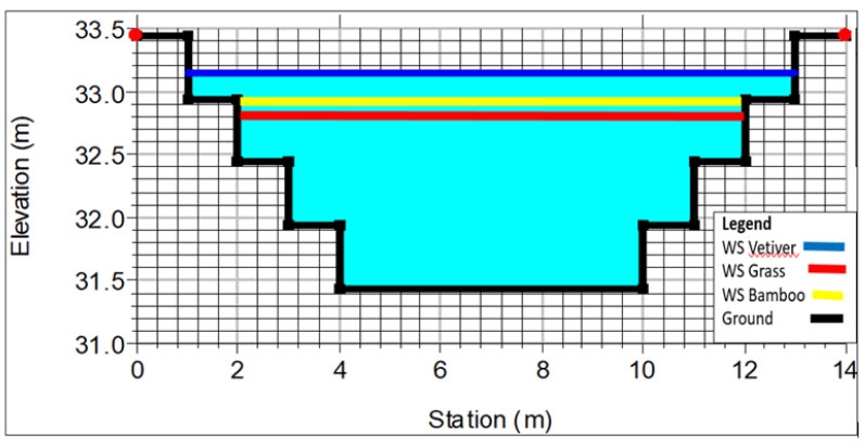Simulation was executed with Manning's roughness (n) value for vetiver grass, shrub grass bamboo plants. These three types of plants were chosen because they were abundant at the site. The simulation results of the water level with each plantation of the 25-year return period flood discharge are shown in Fig. (10). The results indicate that all cross sections planted with vetiver grass, shrub grass, and bamboo plants are able to accommodate flood discharge. The highest water table is the one using vetiver grass, followed by bamboo plants, and the lowest is bush grass. This occurs because the roughness level of vetiver grass is the greatest compared to bamboo plants and shrub grass.