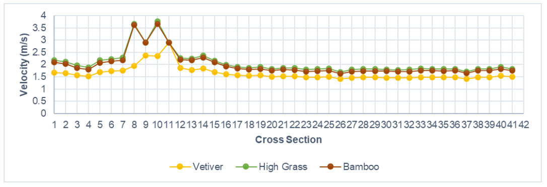 The results also show that the flow velocity is different for each type of plant. Cliffs planted with vetiver grass provide the smallest flow velocity, followed by bamboo plants and finally bush grass. This is also due to the roughness of each type of plant. Vetiver grass is the roughest, resulting in the smallest flow velocity. The results of the flow velocity simulation at each cross-section after the installation of vetiver grass, shrub grass, and bamboo plants are presented in Fig. (11).