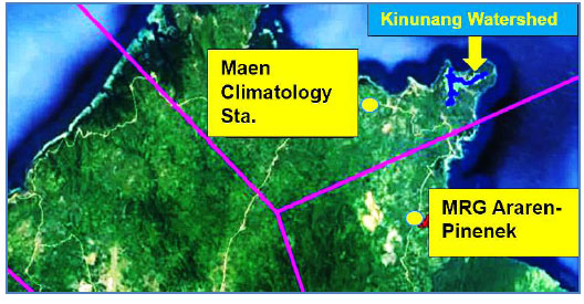 There are two rain gauging stations around the watershed, namely Maen Climatology Station and Araren-Pinenek MRG Station. The location of the two rain gauges in relation to the Kinunang watershed and the Thiessen Polygon is shown in Fig. (3).