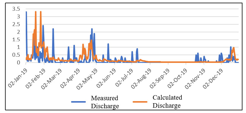 The 2019 watershed average rainfall data was typed into HEC HMS. The calculated discharge was compared to the estimated discharge of the Kinunang River in 2019, then calibrated. One of the parameters calibrated is Curve Number (CN) [23, 24, 25]. Calibration results are shown in Fig. (4), and calibration parameters are presented in Table 8.