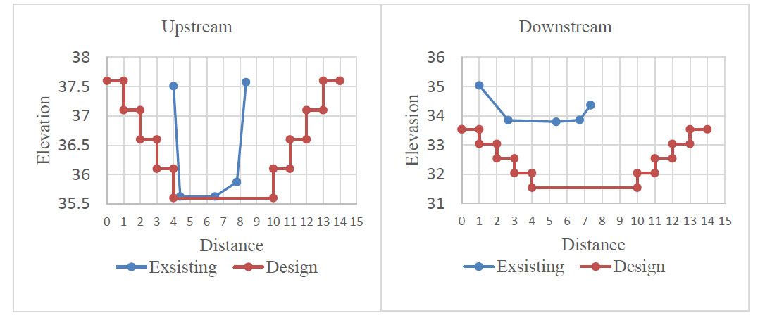 Existing and design cross-section at the upstream (left) and downstream (right).