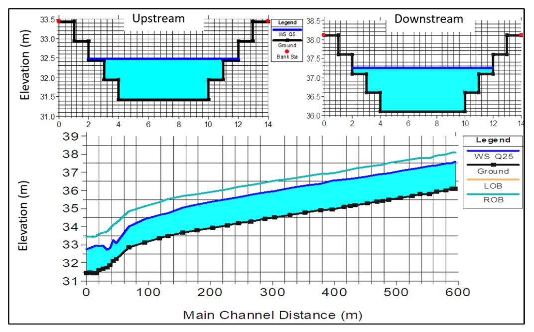 trapezoid channel with an upper width (La) of 12 m, a lower width (Lb) of 6 m, and a depth (h) of 2 m. This dimension can drain the design flood of 24.5 m3/s (Q25). Existing and design cross-section images of upstream and downstream are shown in Fig. (7).