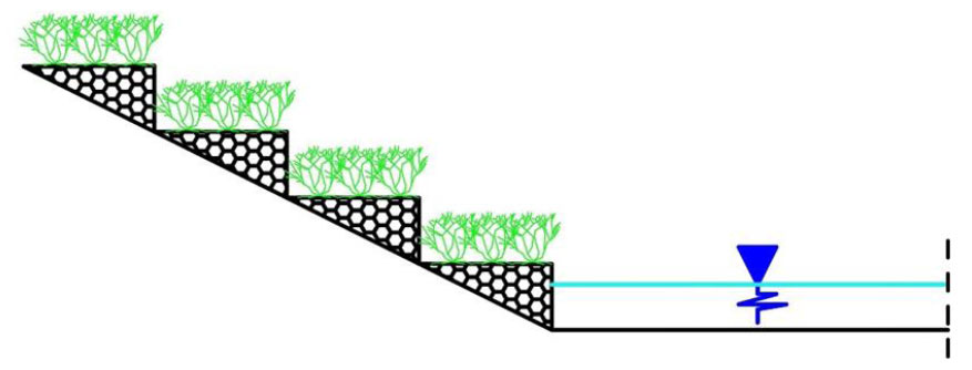 Water level of cross-section plan with vetiver grass, shrub grass, and bamboo plants at the upstream.