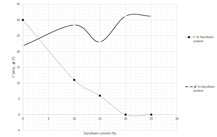 Consolidated Undrained (CU) triaxial tests are carried out on the five Styrofoam-soil mixes according to ASTM D-4767. The samples were prepared as mentioned in the sample preparation section. First, the compacted soil specimen is covered by side drains of filter paper and then placed inside a rubber membrane. The soil specimen is then placed inside the triaxial cell and prepared for the saturation stage. The specimen is filled with water, and the zero readings of cell, back, and pore pressures are recorded. Back and cell pressures are then applied and increased until saturation is reached (until the B coefficient reaches 0.98). Next, the consolidation stage starts by applying a series of incremental vertical loads to the sample using the loading frame. The corresponding changes in axial and pore water pressure are recorded until 100% consolidation is reached. Finally, the shearing stage starts by maintaining the final consolidation pressure and applying an axial load to the sample to initiate shearing. The axial deformation, cell, back, and pore pressures are recorded. The shearing continues until failure is reached and the maximum shear strength is recorded. The readings are recorded with the help of an automatic traxial system (Matest TRIAXLAB), which uses live transducers to record readings at several increments of time for each stage. Each test is conducted twice, once with 50 kPa confining pressure and another time with 100 kPa confining pressure. The results were recorded in tables, which show the values of parameters that were calculated or recorded from the transducers. The values of the effective major and minor principal stress for both tests are used to draw the Mohr’s circles to determine the cohesion (C’) and friction angle (ϕ′). In addition, shear stresses at failure (τ′f) and normal stresses at failure (σ′f) for both confining pressures are determined, which are the values at the intersection with the failure envelope. (Figs. 6-10) show the Mohr’s circles of all Styrofoam-soil mixes. Table 9 shows a summary of Cohesion, friction angle, failure shear, and normal stress results for all mixes. All calculations were done using the necessary equations as per ASTM D-4767. As shown in Table 9 and Fig. (11), the cohesion of the soil (C’) decreases significantly with increasing Styrofoam content. On the other hand, the friction angle (ϕ’) increases with increasing Styrofoam content. This aligns with available findings [24]. However, a decrease was observed in the friction angle after the addition of 15% Styrofoam. Moreover, as demonstrated in Fig. (12), the maximum shear and normal stress notably decreased upon the addition of 10% and 15% Styrofoam. After that, the values don’t decrease or increase in a noteworthy manner. In conclusion, mixing Styrofoam with clay decreases the cohesion, shear, and normal stresses, which likely indicates that Styrofoam is a non-cohesive material. When Styrofoam is mixed with clay, the particles disrupt the clay fabric and weaken interparticle bonding, leading to reduced cohesion. At the same time, the irregular shape and rough surface of Styrofoam increase interparticle friction, contributing to higher friction angles. However, at 15% EPS, the excessive particle content causes discontinuities in the soil matrix, resulting in a non-monotonic friction angle response. It should be noted that while the study identifies consistent trends across compaction, consolidation, and triaxial results, no statistical significance tests were performed, so these trends should be interpreted with caution.