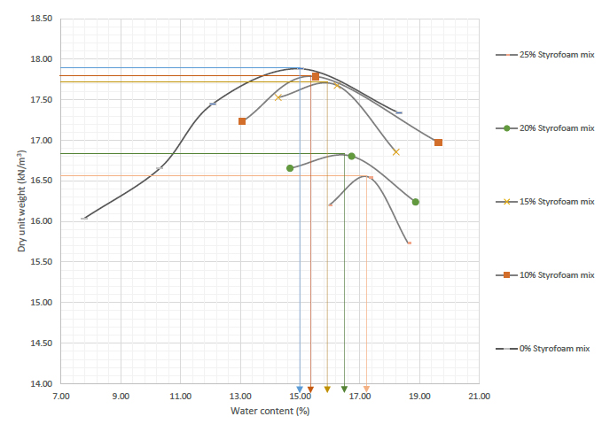 | Styrofoam Content (%) | Maximum dry Unit Weight (kN/m3) | Optimum Water Content (%) |