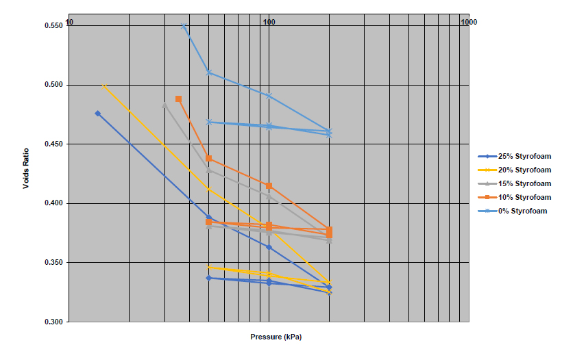 Applied pressure vs voids ratio curve for all styrofoam mixes.