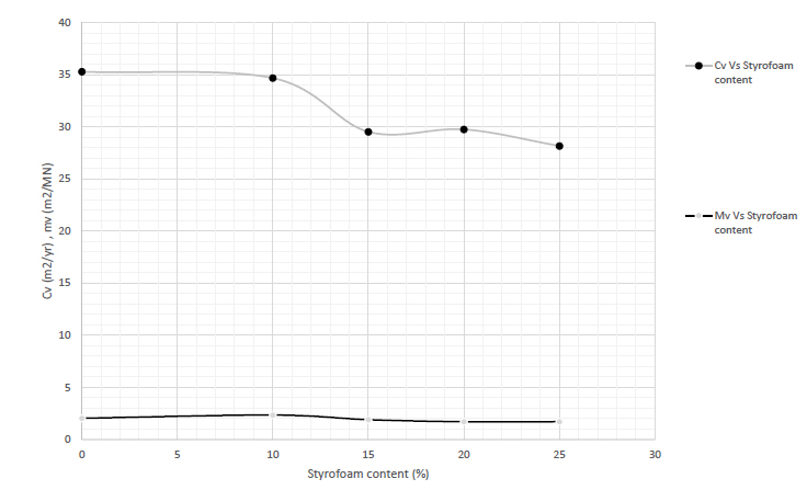 The soil was classified as CL (lean clay) based on the Unified Soil Classification System (USCS). Samples were mixed with 0%, 10%, 15%, 20%, and 25% Styrofoam (2–5 mm grains) by volume. Standard Proctor compaction tests were used to determine maximum dry unit weights and optimum moisture contents. consolidation tests measured swelling pressures and displacements. Coefficients of volume compressibility (m_v) and consolidation (c_v) were calculated. Finally, consolidated-undrained triaxial tests assessed shear strength parameters (cohesion C′ and friction angle φ′).