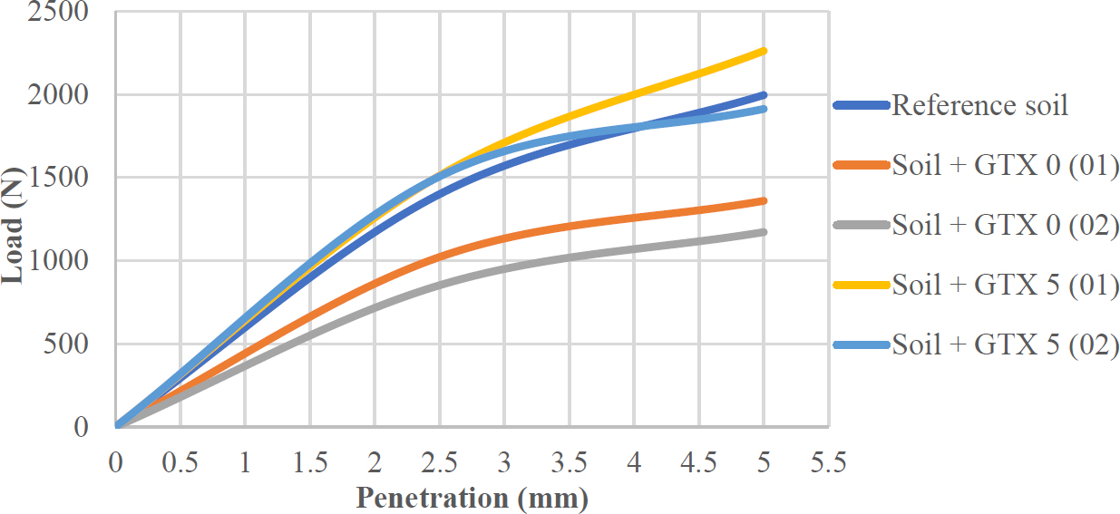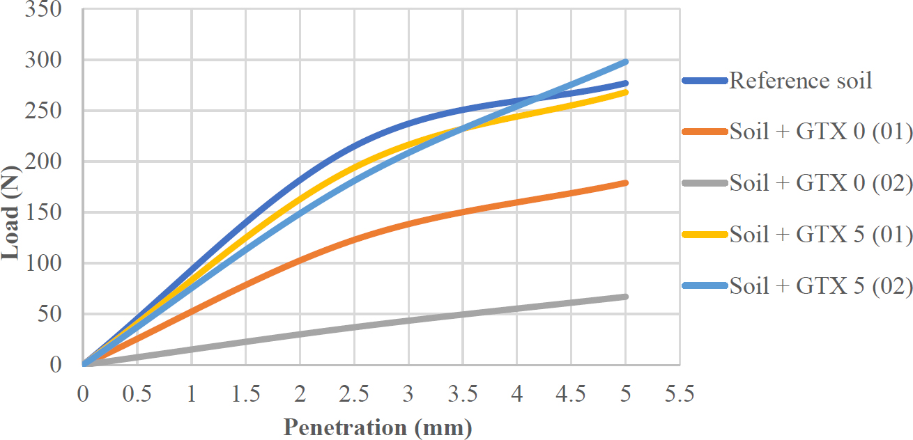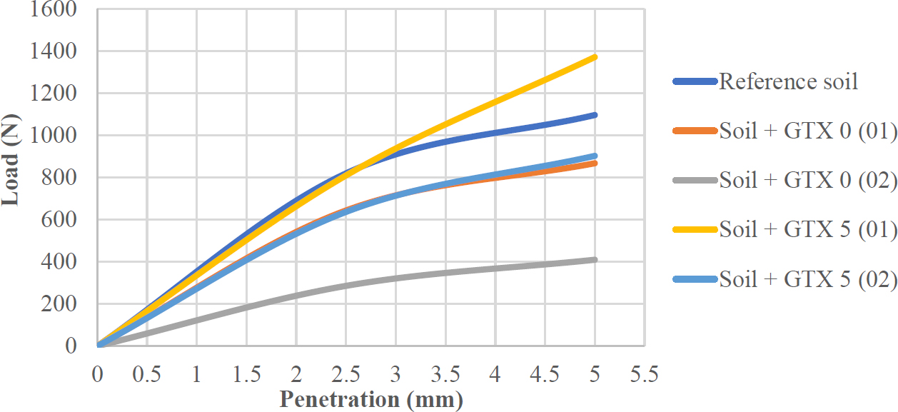 - Soil + GTX 5 (02): reference soil with two 5 mm geotextile layers.
