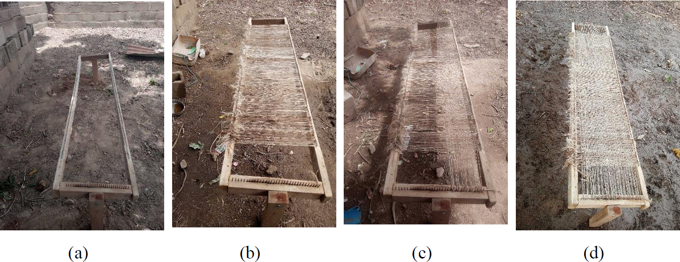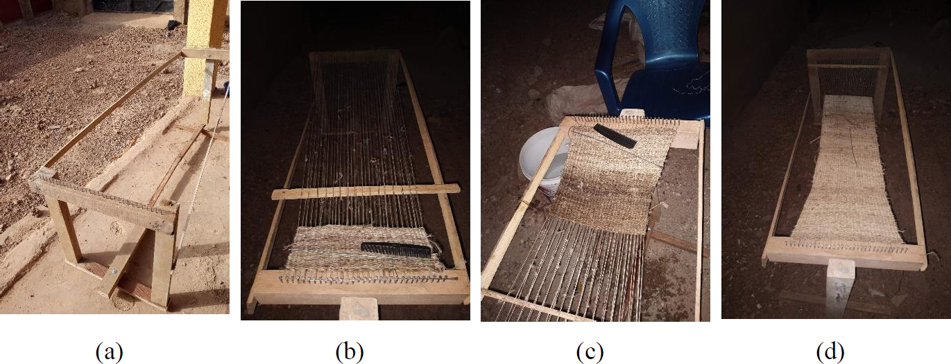 According to the literature, geotextiles with a closed structure have the best mechanical characteristics [19]. Both types were woven manually. They were designed using the plain weave pattern, which is the strongest weave and most resistant to abrasion due to its short undulations between the threads [20]. Figs. (2 and 3) illustrate the weaving process and the products obtained.