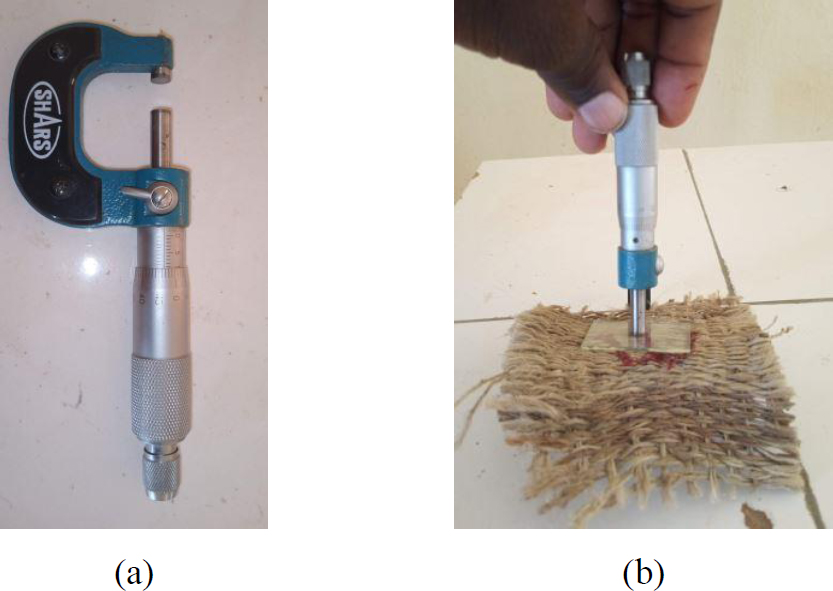 Micrometer (a), measuring the thickness of a geotextile test sample (b).