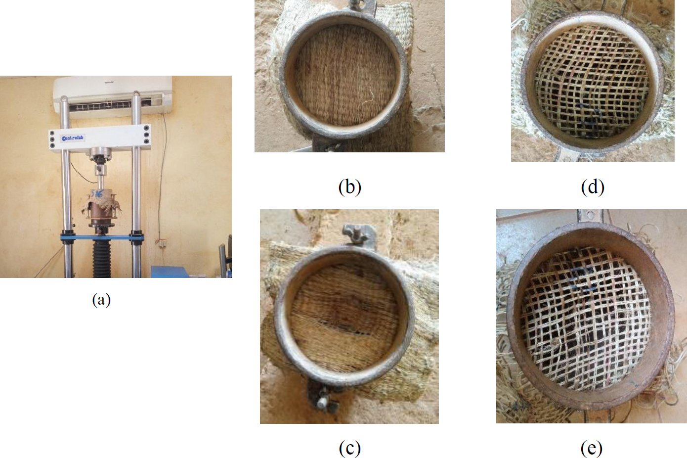 Assembly (geotextile and mold) mounted on the CBR press (a), 0 mm geotextile before (b) and after punching (d), 5 mm geotextile before (c) and after punching (e).