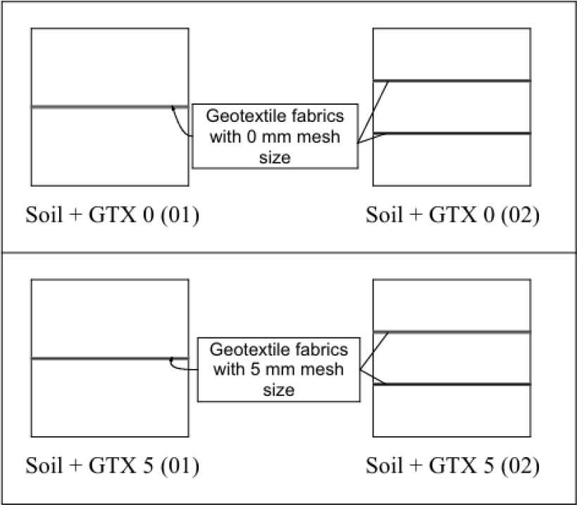 - Soil + GTX 5 (01): reference soil with a 5 mm geotextile layer,