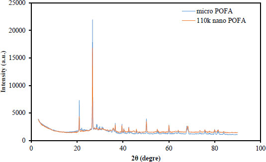 • Upon conducting the grinding process for the second time, the LOI values of all nano POFA increased compared to the micro POFA. While a combination of the thermal treatment and mechanical grinding process improved the sum of chemical content (Al2O3, SiO2, and Fe2O3) to 75.38%. The crystalline phase of the micro POFA and nano POFA demonstrated no significant changes, but a reduction in the peak intensity was found for the 110k nano POFA compared to the micro POFA. Overall, the XRD showed both POFA to be major in quartz with low crystallinity.